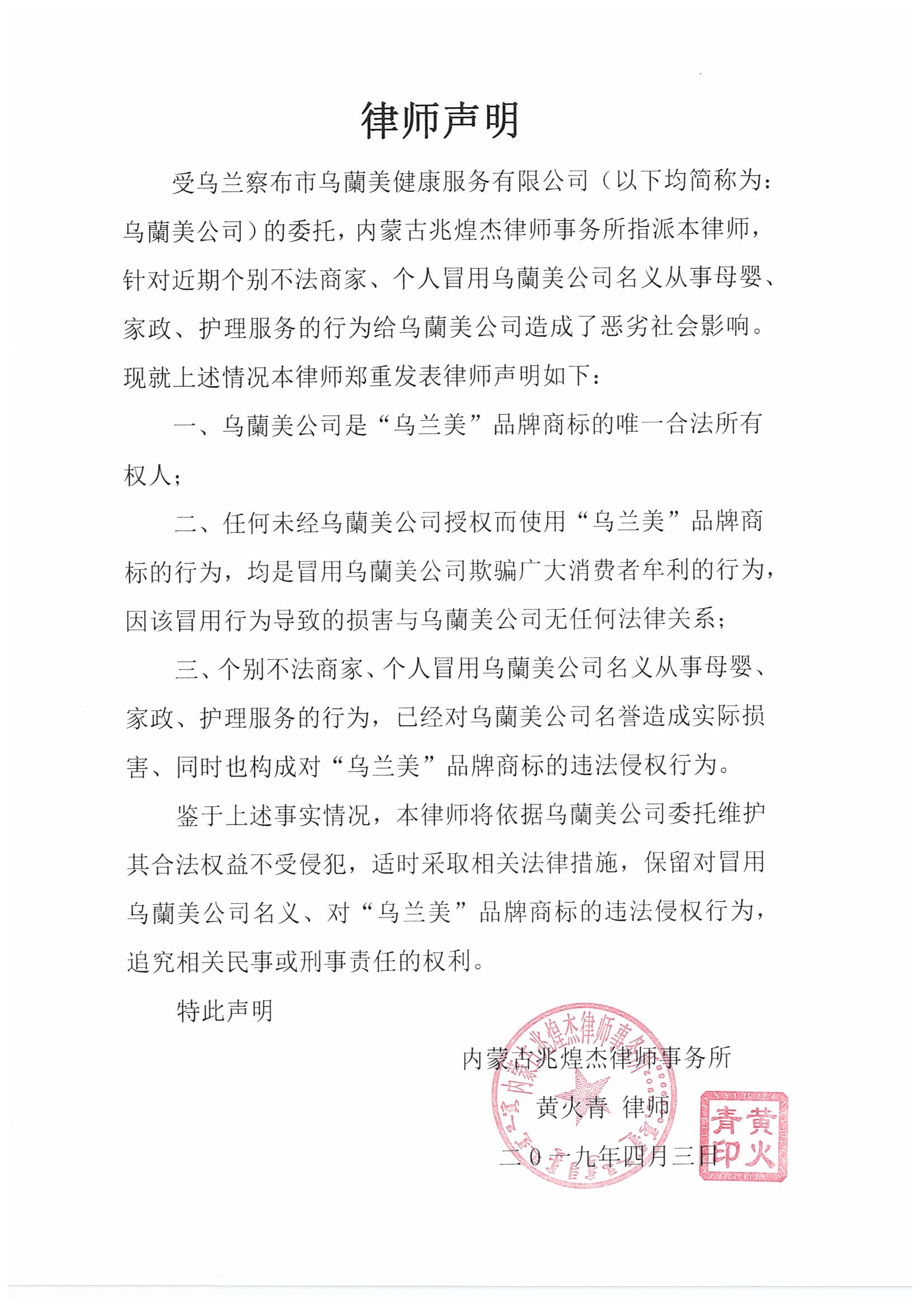 針對近期個別不法商家、個人冒用烏蘭察布市烏蘭美健康服務(wù)有限公司名義從事母嬰、家政、護(hù)理服務(wù)的行為,給公司造成了惡劣的社會影響。現(xiàn)公司委托內(nèi)蒙古兆煌杰律師事務(wù)所黃火青律師,發(fā)表律師聲明如下: